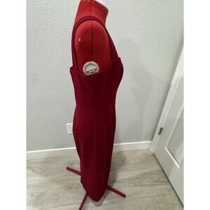 Keywords: red dress, cocktail dress, formal dress, party dress, sleeveless dress, fitted dress, sheath dress, sweetheart neckline, knee length dress, evening dress, special occasion, elegant dress