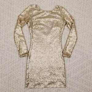 Dress The Population sequin bodycon dress in "Brushed Gold". Size small (S). This fun dress features long sleeves, a boat neck, deep v back, exposed rear zipper, and is fully lined.