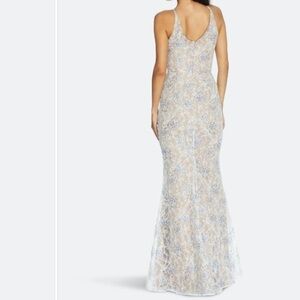 Dress The Population Helen Lace Sleeveless Surplice V-Neck Trumpet Maxi Gown Medium. M = 8-10. Alluring floral lace with metallic lurex details in Off White Multi covers every curve in this form-fitting floor length maxi gown styled with a graceful surplice neckline. Slight trumpet hem. Hidden back-zip closure. Surplice V-neck. Sleeveless. Lined. Perfect for a bride - bridal shower, rehearsal dinner, bachelorette party, and any other wedding festivities. Approx measurements: 15.75“ pit to pit, 14“ waist, & 62“ length. Brand new condition. No stains/flaws. Smoke/pet free home. Offers welcome. Bundle & save. Ship same/next day. Packaged w/ care.