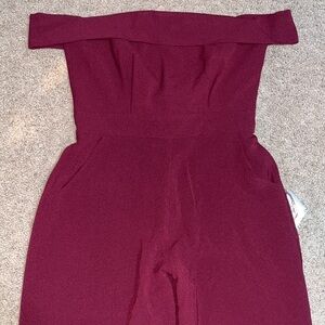 Dress The Population Julian Crepe Off The Shoulder Wide Leg Jumpsuit Burgundy S. Small = 4-6. Show some shoulder in this perfectly glam, wide-leg jumpsuit designed with a fitted waist and inverted pleats at the bodice. Hidden back-zip closure. Off-the-shoulder neck. Cap sleeves. Lined. 97% polyester, 3% spandex. Approx measurements: 14.5” waist, 17” pit to pit, 12.5“ rise, 33.5“ inseam. New condition. No stains/flaws. Smoke/pet free home. Offers welcome. Bundle & save. Ship same/next day. Packaged w/ care.