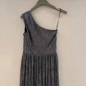 Silver chiffon (57% Polyester, 43% Metallic). A-line. Sleeveless.