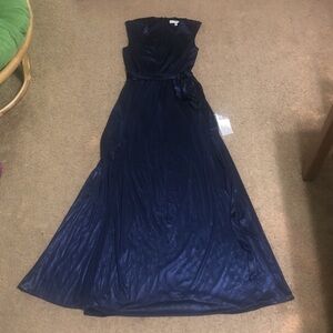 Dress The Population Krista Plunging V-Neck Side Slit Gown Dress Navy Blue M. Medium = 8-10. The Krista is the perfect sleeveless maxi dress for any occasion! This new style has a tie waist belt and fits on like a glove. V-neckline. Tie waist. Coated jersey. Pockets. Slit front. Hidden back zipper. Shell: 92% polyester 8% spandex. Approx measurements: 17.5“ pit to pit, 14.5“ waist, & 61“ length. New condition. No stains/flaws. Smoke/pet free home. Offers welcome. Bundle & save. Ship same/next day. Packaged w/ care.