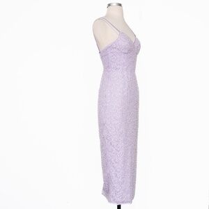 Lilac color fabric with sheer/white lace overlay that is fully beaded with white pearls.