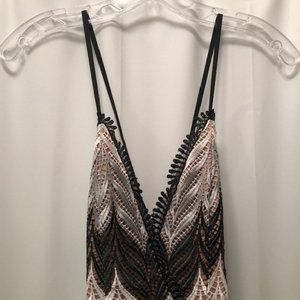 Dress The Population Lucia Maxi Dress in Black White Silver. Perfect day or evening dress. Maxi length. Sleeveless. Deep v-neckline. Flowy silhouette. Criss cross, open, low cut adjustable back. Back zipper closure. Winter formal dress. Wedding guest dress. Wedding party dress. NYE dress. Nude lining to the knee. 100% polyester.