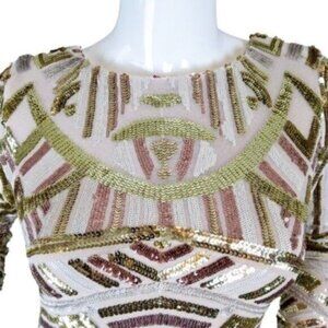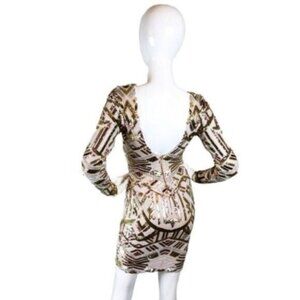 -Features: Dress the Population sequin dress, tribal design, mini length, long sleeve, scoop neck, v-back, invisible zipper in back, neutral, metallic sequin, cocktail dress, party dress