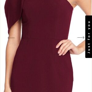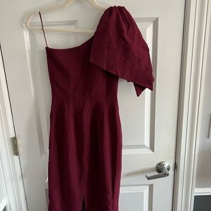 The Tiffany is an elegant asymmetrical dress made in our stretch crepe material in Burgundy. A large bow drapes over the single shoulder strap. The form-fitting silhouette has a straight, midi-length skirt that tapers in at the waist completed with a back slit.