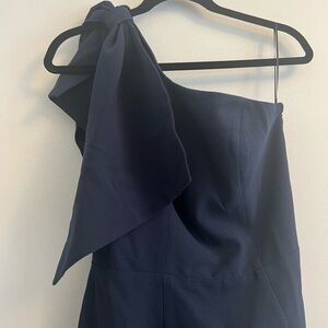 An elegant asymmetrical dress made in our stretch crepe material in Midnight. A large bow drapes over the single shoulder strap. The form-fitting silhouette has a straight, midi-length skirt that tapers in at the waist completed with a back slit. Features include: