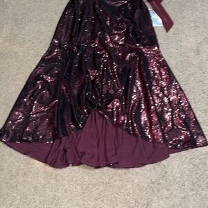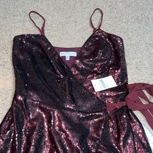 Dress The Population Ulla Sequin Wrap High Low Asymmetric Ruffle Dress Port S. Small = 4-6. Wrap front fit and flare midi sequin dress with a crepe waist tie. Neckline is a deep V with adjustable straps, the high low skirt is finished with a large asymmetrical ruffled hem. Fully Lined. Brilliant sequins sparkle as you twirl in this cocktail number. Approx measurements: 14.25“ pit to pit, 14.5“ adjustable tie waist, & 51.5“ back length. New condition. No stains/flaws. Smoke/pet free home. Offers welcome. Bundle & save. Ship same/next day. Packaged w/ care.