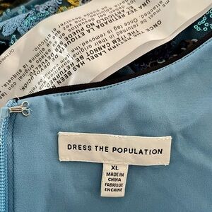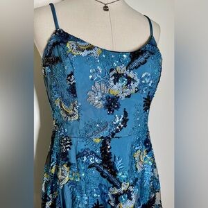 Dress the Population Umalina dress in a fit and flare style. Features beautiful floral sequin pattern upper and the same pattern on a black mesh overlay skirt. Adjustable straps and built in slip. Zip up back, women’s XL.