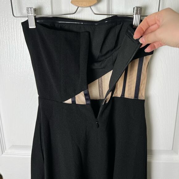 Dress The Population's Anneli strapless fit-and-flare dress is defined by an asymmetric sheer panel on the side.