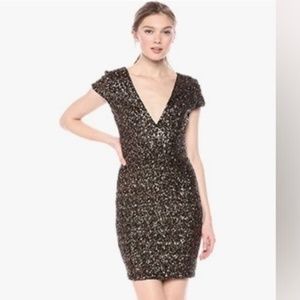 Dress The Population Zoe Sequined Mini Dress in size XS in Antique. Ready to sparkle and shine, dance the night away in the Dress the Population Zoe Sequin Dress. Eye-catching sequins illuminate this figure-flaunting dress with a deep V-neckline, cap sleeves and a fitted bodice with darting. The bodycon skirt ends in a flirty, leg-baring length with a hidden zipper at back. The dress is fully lined in stretch knit and the antique color is a combination of gold and black with dark pewter and brown sequins. In excellent used condition :)