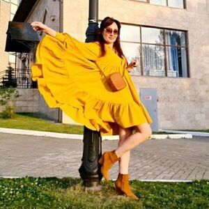 Tunic in crisp cotton poplin. Collar, V-neck opening at front, and dropped shoulders. Long balloon sleeves and wide cuffs with covered buttons. Seams below bust and above hem for added volume. Color is mustard yellow.