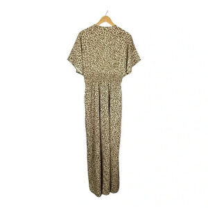 Dress Up Batwing Kaftan Style Maxi Dress, brown, white, and pink leopard print, elastic waist, flowy, women' size large.