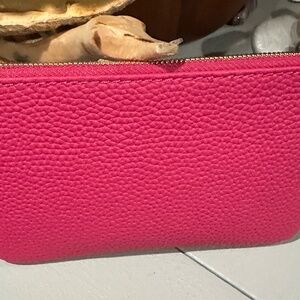 Brilliant pink with gold hardware. 3.5" x 5.5" Used once. New condition!