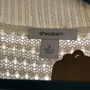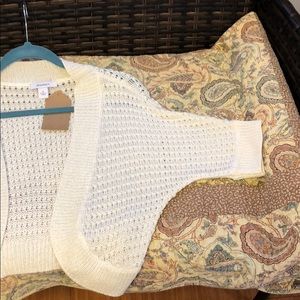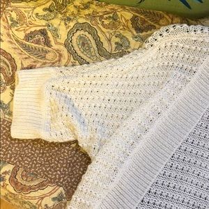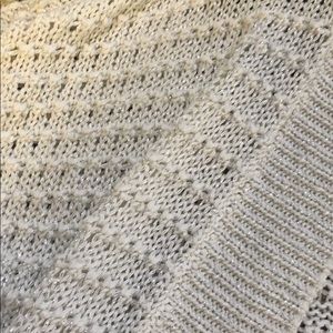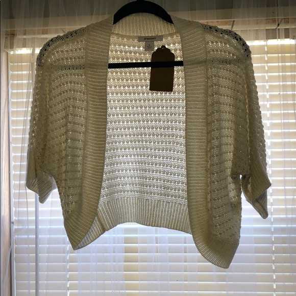 Gorgeous delicate accent jacket for special occasion dresses. Just warm enough to wear for the event or just as a light jacket until you arrive. Silver treading woven into the creamy white knit.