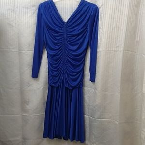David Rose blue cocktail dress, knee length, size 16. Front has sequin design. Should to hem is 45 inches. Pit to pit with material stretched out is 20 inches. Waist is 20 inches. Top is sleeve to wrist is 24 inches. Gently used.