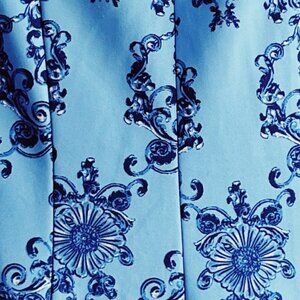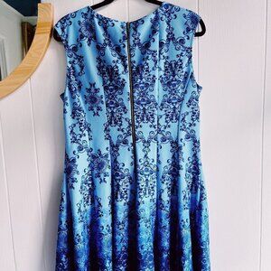 Beautiful Fluer de Lis Dress Fit and Flare Style. Vintage Like New. Sz 14 Long Gold back zipper. Light Blues to Dark Blues.