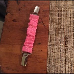 Pink and white polkadot print on this 7" dress cinch clip. Great for any item you want to give more shape to. These are also great as toddler belt clips. Clips have a plastic insert to protect clothes.