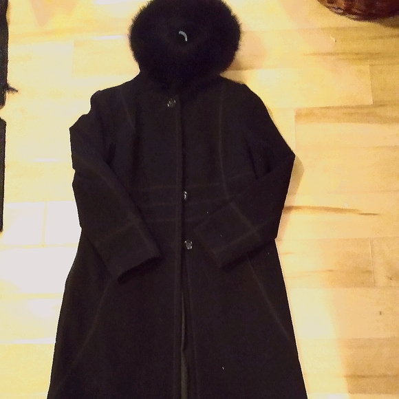 This long black coat with faux fur hood is warm an beautiful.