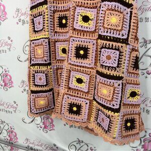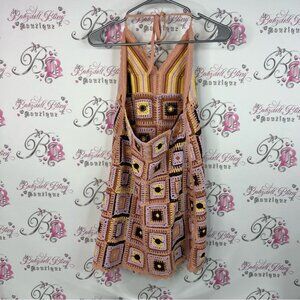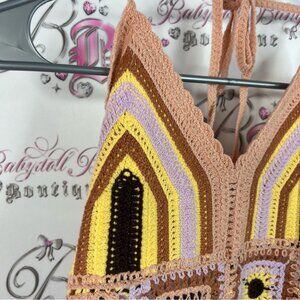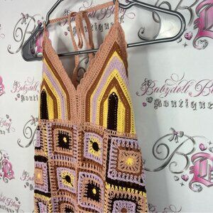 Vibrant crochet halter dress with geometric patterns. Features shades of pink, yellow, and black. No tags. Unsure of exact size. See measurement.