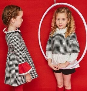 Winter Holidays collection little girl dress. Pattern black and white gives a slim feel. Dress fitted at waist falls loose on legs. The fabric is very gentle