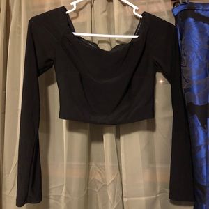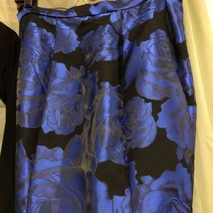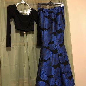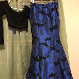 Superrrrr cute two piece prom dress! I know the pics aren’t great so if anyone is interested I can provide more. The top is a jersey stretch type material and off the shoulder. The bottom is a beautiful deep blue fabric with black flower detail. The bottom flares out to be a mermaid style which gave me curves i do not normally have lol. Fits like a 0. Was altered to my height- I am 5’3 and I wore flats.