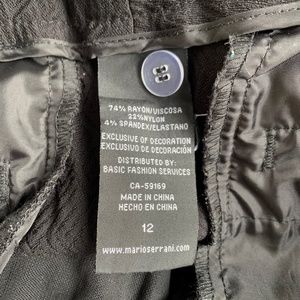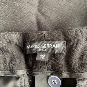 Mario Serrani ankle dress pants, solid black with geometric texture, straight leg, size 12 (Waist flat: 16.5", Rise: 10", Inseam: 28.5"), preowned and shows general wear. Pet friendly home