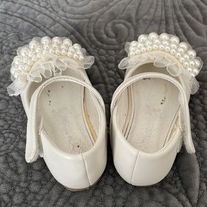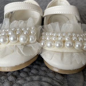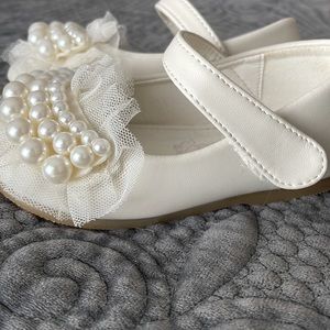 Beautiful ivory dress shoes was purchased for a wedding flower girl dress. Size 22 perfect on the outside a little dirty on the inside. Conversion size says 18 to 24 months. My daughter was 2.