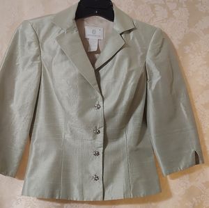 Watters & Watters silk dress suit, sage in color; jacket and pencil skirt; fully lined; kick pleat to back of skirt; 100% silk; decorative faux buttons on jacket, clear plastic buttons to secure; invisible zipper with hook and eye closure. (pink dot to label from dry cleaners)