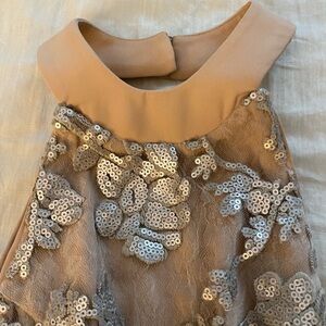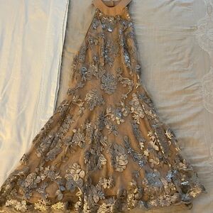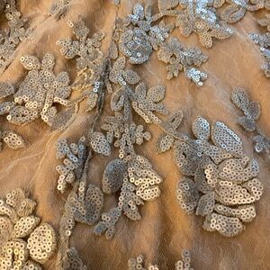 Stunning silver floral embroidered and mesh lace with sequins over nude lining. This fit and flare dress with a high neckline and low cut back is veiled in romantic floral lace and is ready to party with after hours sparkle. Back zipper. Banded neck