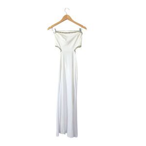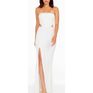 This elegant gown features a strapless design, a waist cut out, and a front slit for a stunning mermaid silhouette.