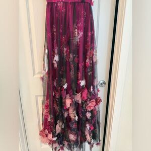 Cut from floral-print organza, the Dress the Population Black Label "Aurea" gown flutters with floral appliqué and ruched finishes
