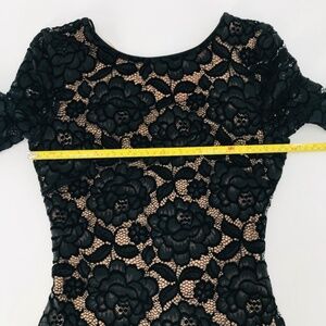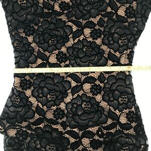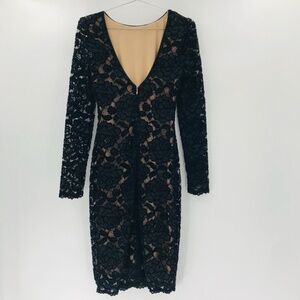 Elegant black lace midi dress. Long sleeves. Intricate floral pattern.
