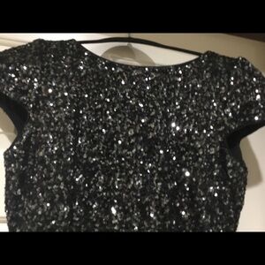 Elegant black midi dress with shimmering sequins. Cap sleeves and fitted silhouette. Perfect for evening events.
