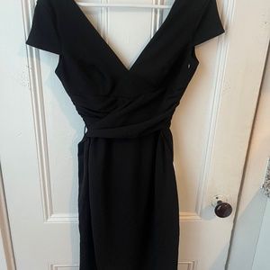 A cut-to-flatter body-con sheath is styled with a deep V-neck, an even deeper square back and a crisscrossing sash at the waist to slim as it shapes. Unworn, one tag (large fabric tag that can attest to it still being unworn/unused) still attached. Plastic portion of tag still attached to shoulder. Mint condition, great little black dress to keep in rotation.