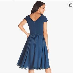 Flattering fit and flare cocktail dress with a v neck and cap sleeves. Crepe upper with a layered chiffon skirt. Fully lined, back zipper