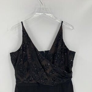 Black tank dress with a sequin surplice bodice and black crepe skirt with slit