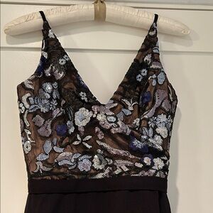 This sophisticated black midi dress features a sequin floral embroidered blue and silver hue over a black nude mesh base bodice and a slim tailored crepe skirt with a sleek slit. Surplice V-neckline and adjustable spaghetti straps. Back zip closure. Ideal for cocktail parties and elegant events.