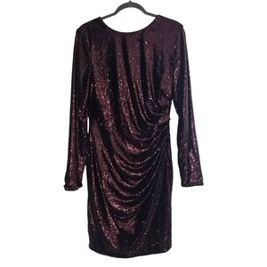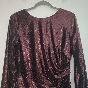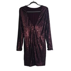 Sparkle, Long sleeve, body-con mini dress features sequin details and a plunging back, making it a sexy yet classy choice for your next night out.