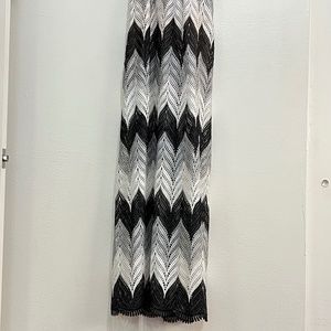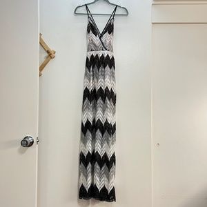 Bold chevrons pattern this figure-flattering maxi dress, both bright and luxurious.