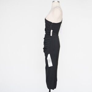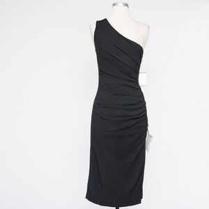 Dress the Population Martine Stretch Crepe One-Shoulder Dress in size Medium. This stunning crepe sheath dress features a flattering one-shoulder neckline and side ruching that creates a sleek, body-con silhouette. Perfect for a night out or special event, the dress has a hidden side-zip closure and is fully lined for comfort. Made from a blend of 90% polyester and 10% spandex, it offers a bit of stretch for a tailored fit.
