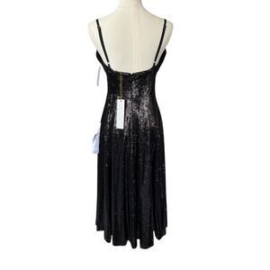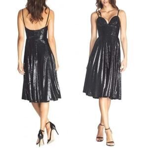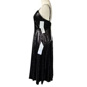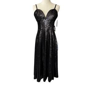 Dress the Population Mimi Sequin Cocktail Midi Dress in Ebony (Black). Size Medium. Features: hidden back-zip closure, sweetheart neckline, and adjustable straps. Lined.