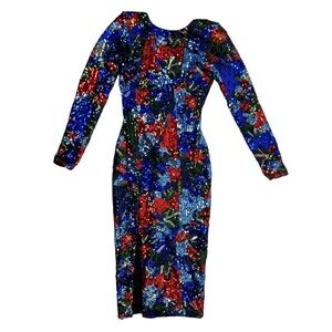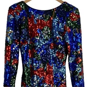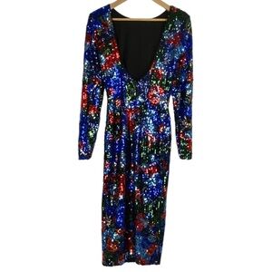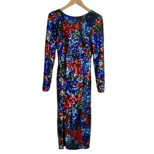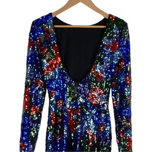 Dress the Population Natalie sequin dress with long sleeves, V-back, front slit, and hidden back zipper. This was a sample dress for a store; missing size and fabric tags. Measures like an XS or