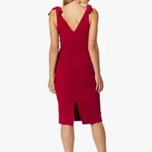 Key Words: Semi Formal, Red, Elegant, Midi, V Neck, Cocktails, Formal, Dinner, Date, Cocktail, V Neck, Bows, vibrant, elegant, evening wear, sleeveless