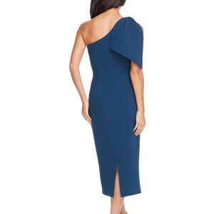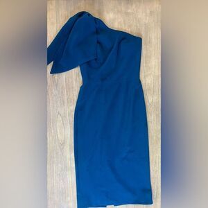 Dress the Population Tiffany Dress in Peacock Blue. Size Small. Asymmetrical neckline. One-shoulder draped detail. Side zipper. Slit at back. Lined. Dry clean. Brand new with tags- never worn.