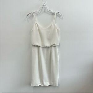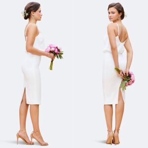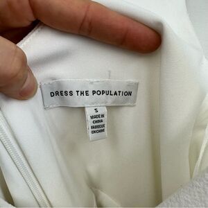Elegant white midi dress by Dress the Population. Features a sleek silhouette and delicate straps. Perfect for formal occasions.
