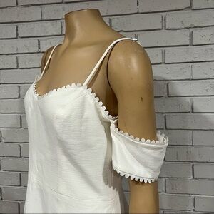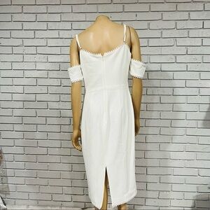 White crepe (97% Polyester, 3% Spandex). Sheath. Sleeveless. Sweetheart neckline. Hidden back zipper with hook-and-eye closure. Fully lined. Back slit.
