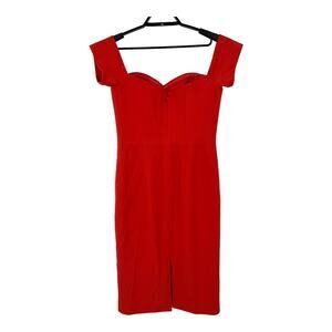 color: poppy, bodycon, midi, off shoulder, pencil skirt, hidden back zip closure, off the shoulder sweetheart neck, short sleeves, back slit, lined