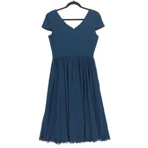 color: peacock blue, crepe dress, chiffon skirt, hidden back zip closure, v neck, cap sleeves, lined