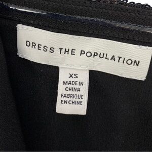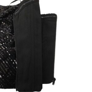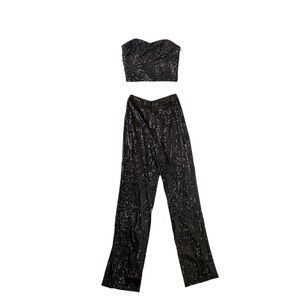 Dress the Population Sequin Strapless Crop Top with Wide legged Pants. Top has a side zipper; pants have a back zipper. This set is similar to the Dress the Population Olivia Black Luxe Sequin Two-Piece Set, but this set does not have straps on the top. This is a sample set from a store. It is new without tags. Please see the pictures for more details and measurements.